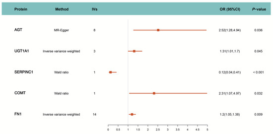 The primary analysis identified five proteins that were causally associated with PC at the blood level, as determined using IVW as the main MR method. These significant findings, along with the analytical approach, are illustrated in Figure 2. Specifically, the genetically predicted levels of four proteins (AGT, COMT, FN1, and UGT1A1) were positively associated with increased PC risk, while SERPINC1 was negatively associated with PC risk. Detailed information on the corresponding drug target interactions and their effects on PC risk are provided in Table 1. COMT and UGT1A1 are involved as substrates or inducers in the metabolism of hormonal drugs such as ethinyl estradiol, desogestrel, and estradiol valerate. In contrast, AGT, FN1, and SERPINC1 are known targets modulated by ethinyl estradiol [41] and combined oral contraceptives, including formulations co-administered with levonorgestrel, gestodene, norgestimate, and dienogest [42,43,44,45,46,47]. Notably, while ethinyl estradiol combined with dienogest has been reported to influence SERPINC1 activity [48], other COC formulations have been associated with either the upregulation or downregulation of these protein expression levels, depending on the specific drug combination and context.