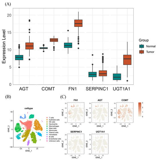 To investigate the cell type-specific expression patterns of the identified protein-coding genes and their potential roles in PC development within distinct cellular contexts, we analyzed scRNA-seq data from 16 samples obtained from the GSE155698 dataset [38,39]. As shown in Figure 3B, all cells were manually annotated and classified into 11 clusters: T cells, epithelial cells, NK cells, neutrophils, monocytes, mast cells, plasma cells, fibroblasts, B cells, endothelial cells, and unknown cells. Cell type-specific gene expression profiles are shown in Figure 3C. After adjusting for p-value and performing the Wilcoxon rank-sum test, COMT was found to be ubiquitously expressed across all cell types, with the exception of monocytes. In contrast, AGT and FN1 were observed to exhibit highly cell type-specific expression patterns, with both genes predominantly expressed in fibroblasts compared to other cell clusters (Log2 FC values of 1.28 and 3.94, respectively). Additionally, FN1 exhibited notable expression in endothelial cells. No significant or specific expression of SERPINC1 or UGT1A1 was detected in any particular cell type in the single-cell dataset.