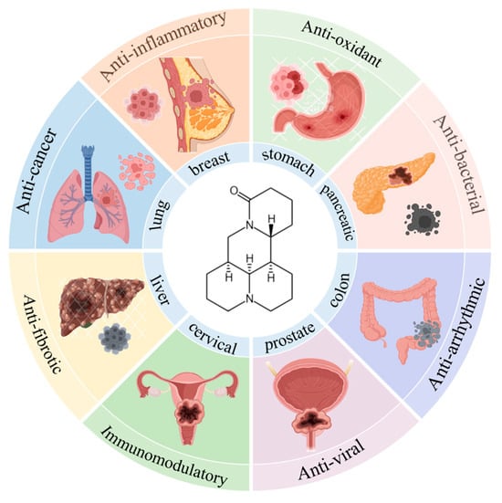 - Sun, X.Y.; Jia, L.Y.; Rong, Z. Research advances on matrine. Front. Chem. 2022, 10, 867318. [Google Scholar] [CrossRef]
