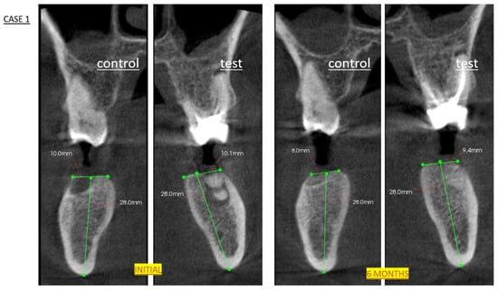 The comparison between the degree of bone filling found in the radiographic examination (CBCT) between the test group and the control group was in favor of filling the alveolus with DBBM (Figure 5).