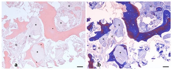 Representative hematoxylin and eosin (H&E) (a) and Masson’s trichrome (b) image of example from analytic field, in which three main components quantified are evidenced: neoformed bone (asterisk *), connective tissue (letter C), and implant debris (cross symbol +). Scale bar: 100 µm.