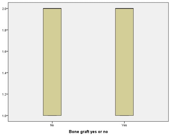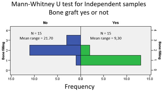 Significant differences in alveolar filling at 6 months were observed between sockets filled with DBBM and those left to heal spontaneously, as determined with a Mann–Whitney U test (p < 0.001; see Figure 5).