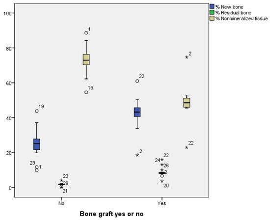 To compare differences in the percentages of newly formed bone, residual bone, and nonmineralized tissue, a Mann–Whitney U test was performed. The results were statistically significant for all three variables (p < 0.001). The results indicate that for bone filler, U = 19.5; Z = −4.268; and p < 0.001, with a substantial effect size of r = −0.77. For newly formed bone, U = 203.0; Z = 3.755; and p < 0.001, with a significant effect size of r = 0.68. With respect to residual bone, U = 424; Z = 4.626; and p < 0.001, with a notable effect size of r = 0.68. Finally, for nonmineralized tissue, U = 10.0; Z = −4.252; and p < 0.001, with a substantial effect size of r = −0.77. The effect size (r) was calculated using the following formula: r = , where N is the total number of observations.