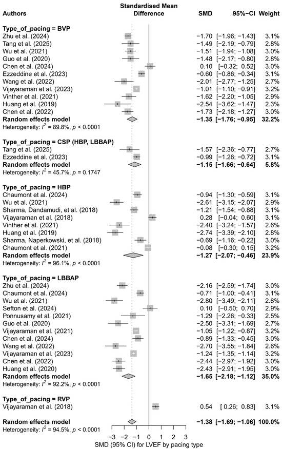Forest plot for the subgroup analysis according to the type of pacing. Subgroups: HBP, LBBAP, CSP (HBP + LBBAP), BVP, RVP. The greatest improvement in LVEF was observed in the LBBAP group (SMD = −1.65), while the smallest effect was noted in the RVP group (SMD = 0.54). The differences between groups were statistically significant (p < 0.0001). Heterogeneity was elevated in all subgroups except for CSP (I2 = 45.7%) [21,30,31,32,34,35,36,37,38,39,41,43,44,45,48,49,50,51,53,55].