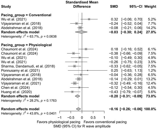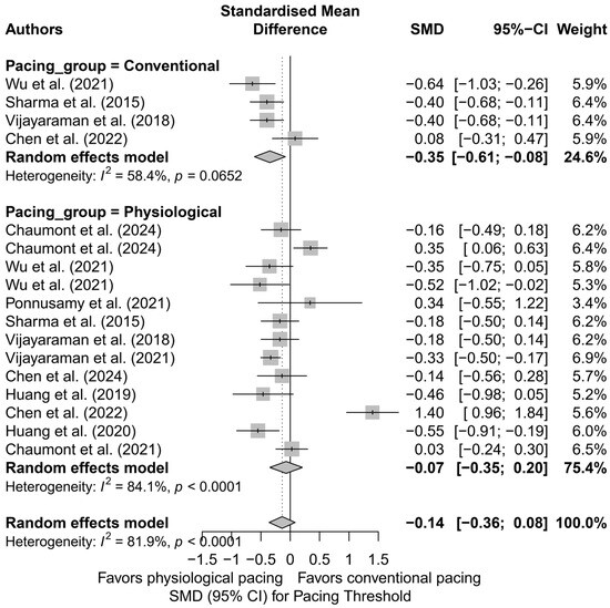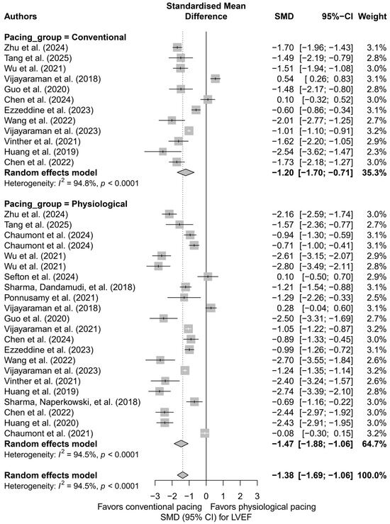 Similar conclusions arise from the analysis comparing physiological pacing (HBP, LBBAP) with conventional pacing (BVP, RVP). The effect was greater in the physiological group (SMD = 2.06; 95%CI: 1.70 to 2.42) than in the conventional group (SMD = 1.61; 95%CI: 0.72 to 2.50), although this difference was not statistically significant (Q = 0.84; p = 0.36). The results are summarized in Figure 13.