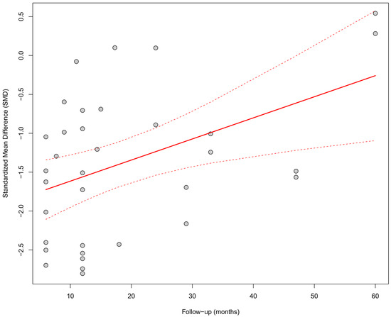 In the conducted meta-regression including follow-up time, no significant relationship was found between the duration of follow-up and the effect size (β = −0.0445; p = 0.233; R2 = 3.5%). The trend suggested a slight reduction in the effect with longer follow-up, but it did not reach the threshold of statistical significance.
