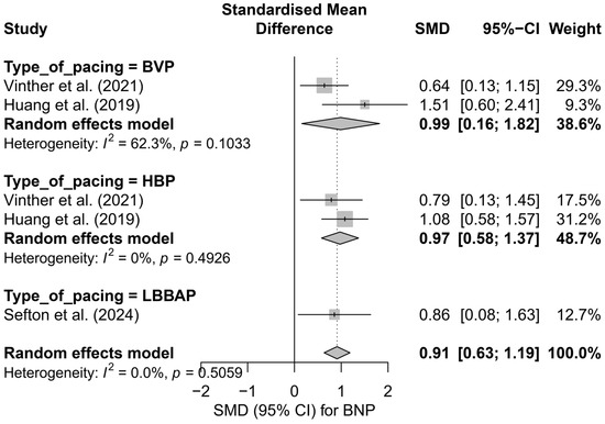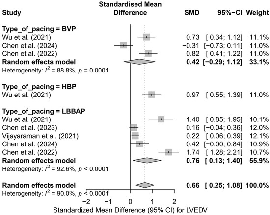 SMD in LVEDV according to the type of pacing—subgroup analysis (BVP, HBP, LBBAP) in the random-effects model. The strongest effect was observed for physiological techniques (LBBAP, HBP) [32,33,34,48,53].