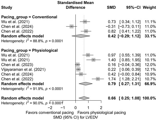 A further comparison combining physiological techniques (LBBAP and HBP) with conventional pacing (BVP) also favored physiological pacing. In the physiological group, a significant reduction in LVEDV was demonstrated (SMD = 0.79; 95%CI: 0.27 to 1.31; I2 = 91.9%), whereas for conventional pacing, the result was not statistically significant (SMD = 0.42; 95%CI: −0.29 to 1.12; I2 = 88.8%). Despite clear differences in the estimates, the test comparing the groups did not reach statistical significance (Q = 0.70; p = 0.404), which may be due to the small number of analyses and substantial heterogeneity. A comparative plot of the physiological and conventional groups is presented in Figure 6.