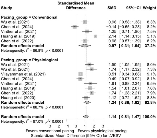 Similar observations were obtained in the analysis directly comparing physiological and conventional pacing, presented in Figure 8. The effect of LVESV reduction was more pronounced for physiological techniques (SMD = 1.24; 95%CI: 0.86 to 1.62; I2 = 88.7%) than for conventional BVP (SMD = 0.97; 95%CI: 0.31 to 1.64; I2 = 86.8%). This difference did not reach statistical significance (p = 0.492), but the direction and magnitude of the clinical effect remain consistent with the analysis based on pacing technique.