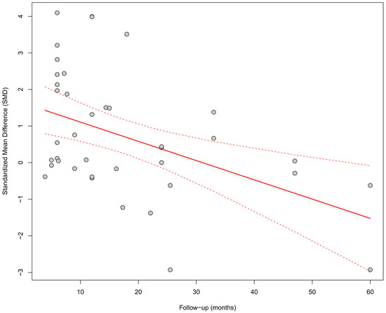 The meta-regression analysis with follow-up time as a moderating variable showed a trend suggesting that longer follow-up may be associated with a smaller clinical effect (β = −0.0356; SE = 0.0199; p = 0.073), with 15.3% of the heterogeneity explained by this variable.