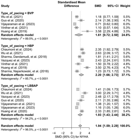 In the subgroup analysis according to pacing technique (BVP, HBP, LBBAP), a significant improvement in the NYHA class was observed across all three groups: the greatest effect was recorded for HBP (SMD = 2.20; 95%CI: 1.66 to 2.73), and the smallest for BVP (SMD = 1.61; 95%CI: 0.72 to 2.50). However, the differences between techniques did not reach statistical significance (Q = 1.31; p = 0.519), as shown in Figure 12.