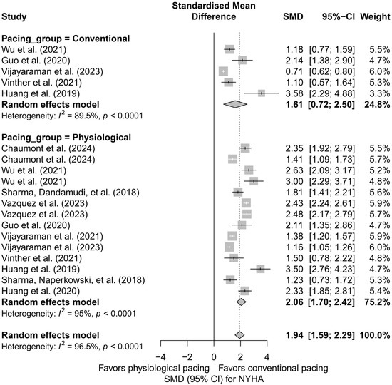 The analysis including 19 comparisons from 11 publications demonstrated a clear improvement in the NYHA functional class following the implantation of a pacing system, regardless of the technique used. For ease of interpretation, clinical improvement (decrease in NYHA class) was presented as a positive SMD value. In the random-effects model, a significant overall effect was obtained (SMD = 1.94; 95%CI: 1.59 to 2.29; p < 0.0001), with very high heterogeneity among studies (I2 = 96.5%). These results are illustrated in Figure S5, presenting the forest plot for all analyzed comparisons.