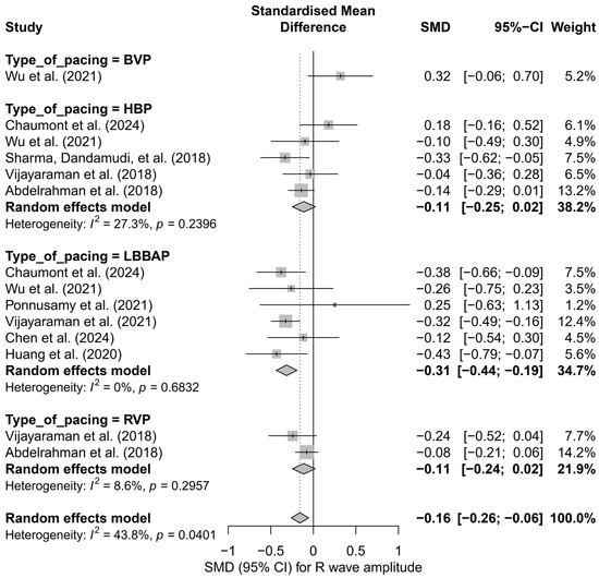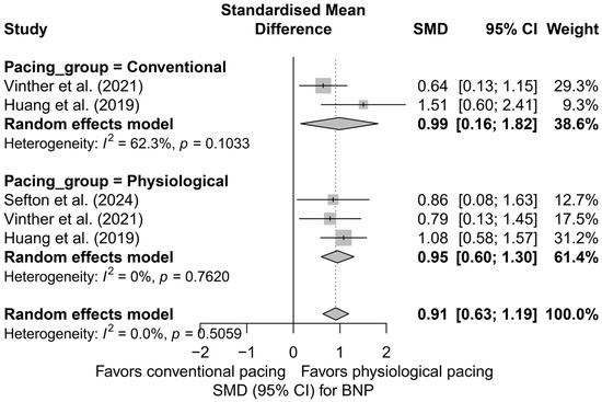The subgroup analysis based on the type of pacing technique is illustrated in Figure 7. The greatest effect was observed for HBP (SMD = 1.53; 95%CI: 1.22 to 1.84), with no heterogeneity (I2 = 0%). LBBAP also showed a significant, moderate effect (SMD = 1.09; 95%CI: 0.55 to 1.63), although with very high variability between studies (I2 = 90.3%). The smallest effect was seen in the BVP group (SMD = 0.97; 95%CI: 0.31 to 1.64; I2 = 86.8%). The differences between techniques did not reach statistical significance (p = 0.179), but a noticeable gradient in effect size favored physiological pacing.