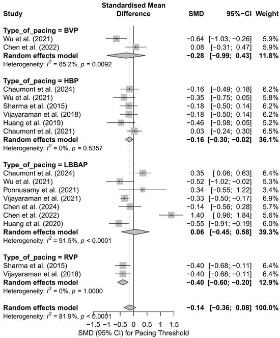 The subgroup analysis according to the applied pacing technique revealed that the most pronounced reduction in LVEDV occurred in LBBAP—SMD = 0.76 (95%CI: 0.13 to 1.40; I2 = 92.6%) and HBP—SMD = 0.97 (95%CI: 0.55 to 1.39; based on a single study). For conventional BVP pacing, the effect was lower and did not reach statistical significance (SMD = 0.42; 95%CI: −0.29 to 1.12; I2 = 88.8%). The differences between techniques did not reach the threshold for statistical significance (Q = 1.77; p = 0.412), although a trend favoring physiological techniques was observed. A graphical representation of this analysis is presented in Figure 5.