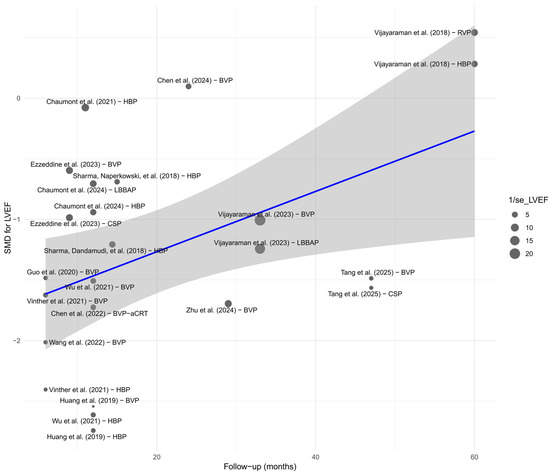In the meta-regression including follow-up duration (k = 40), a significant inverse relationship was observed between follow-up length and the SMD effect size (β = −0.0527, SE = 0.0164, p = 0.0013, R2 = 19.5%). This result suggests that the beneficial effect of physiological pacing on QRS shortening may diminish over time (Figure 11).