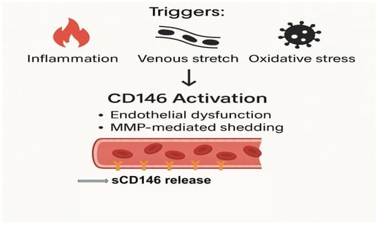 In the context of HF, elevated intracardiac and venous pressures result in a mechanical stretch of endothelial cells, a powerful stimulus for CD146 shedding [23]. Additional factors such as hypoxia, ischemia–reperfusion injury, and oxidized low-density lipoprotein (oxLDL) may synergistically enhance both transcriptional upregulation and post-translational modifications of CD146. Collectively, these regulatory mechanisms underscore the dynamic sensitivity of CD146 expression to diverse pathological stimuli, reinforcing the utility of circulating sCD146 as a biomarker of vascular stress and systemic congestion, as illustrated in Figure 1 [19,32].