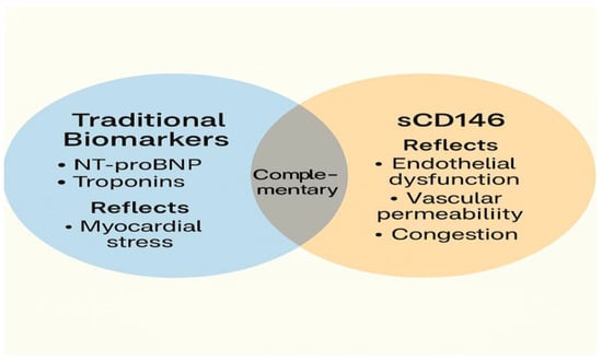 Rather than serving as a replacement for established biomarkers, such as NT-proBNP or troponins, sCD146 should be viewed as complementary, offering distinct yet synergistic information about vascular congestion and endothelial integrity, as depicted in Figure 2 [20,34,36,38]. When combined with NT-proBNP, sCD146 has been shown to improve diagnostic precision in patients with borderline or ambiguous presentations, particularly those with multiple comorbidities or non-specific dyspnea [20].