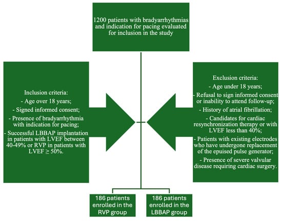 The pacing strategies were established by the operators based on current practices. The LBBAP group included all patients who had undergone successful LBBAP procedures and who were at least 18 years old but with mildly reduced LVEF (40–49%), while the RVP group was formed by patients who received mid-septal pacing. The implantation method was decided based on LVEF. In our clinic, all patients are evaluated echocardiographically before the implant. The patients with LVEF over 50% were included in the RVP group, while patients with LVEF between 40 and 50% were included in the LBBAP group. We consecutively enrolled the patients, retrospectively. During patient enrollment, the manner of patient inclusion was 1:1; each time we enrolled an LBBAP implant, we subsequently included a patient with RVP. The exclusion criteria were established as follows: persons under 18 years of age; persons who refused to provide written informed consent or to participate in regular clinic check-ups; patients with a history of atrial fibrillation or previous trans-catheter ablations for atrial fibrillation; candidates for cardiac resynchronization therapy or with LVEF less than 40%; patients with existing leads who underwent replacement of the worn-out pulse generator; patients with severe valvular disease requiring cardiac surgery. The study design is shown in Figure 1.