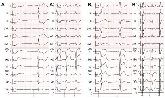 For RV pacing, we used an active fixation lead that was placed in contact with the right ventricular septum in the middle region, using a preformed stylet. The fixation was performed in the anteroposterior view, and a 30° left anterior oblique view was applied to confirm the accuracy of the lead position, as previously described [20]. The paced QRS (pQRS) morphology was left bundle branch block with an intermediar axis as shown in Figure 2A,A’.