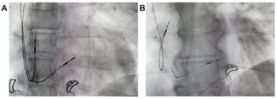 In unipolar pacing, left bundle branch area pacing (LBBAP) is characterized by a terminal r/R wave in lead V1 (Figure 2B,B’) or right bundle branch block (RBBB), accompanied by one of the following criteria for left bundle branch pacing: a short and consistent left ventricular activation time (LVAT from stimulus) below 80 ms at both high and low output in lead V6; the presence of the LBB potential; or a QRS transition during threshold testing or programmed ventricular pacing (from nonspecific LBBAP to specific LBBAP) [21]. Comparative fluoroscopic images for the two implant techniques/methods analyzed in our study are shown in Figure 3.