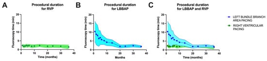 (A) Fluoroscopy time over the three years of enrollment in the right ventricular pacing (RVP) group of patients. (B) Fluoroscopy time over the three years of enrollment in the left bundle branch area pacing (LBBAP) group of patients. (C) Overlap of fluoroscopy time over the three years of enrollment for the two patient groups.