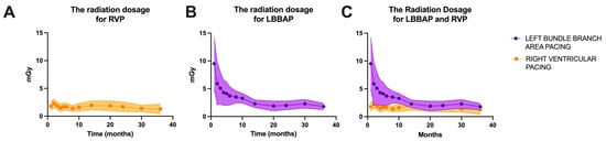 (A) Radiation dosage (milligray, mGy) over the three years of enrollment in the right ventricular pacing (RVP) group of patients. (B) Radiation dosage time over the three years of enrollment in the left bundle branch area pacing (LBBAP) group of patients. (C) Overlap of radiation dosage over the three years of enrollment for the two patient groups.