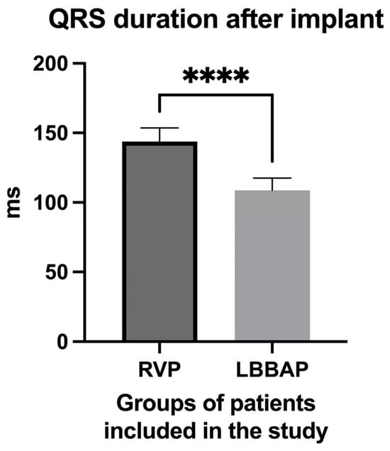The most important electrocardiographic parameter used in our study was the QRS complex duration. We observed in the LBBAP group of patients a mean QRS complex duration of 108.7 ± 8.83 ms (Figure 6) after pacemaker implantation, compared with a much longer duration in the RVP group (143.8 ± 9.851 ms, p = <0.0001), although in this latter group of patients, only the patients who had the right ventricular lead implanted only mid-septal and not at the right ventricular apex or in other completely non-physiological areas were included.