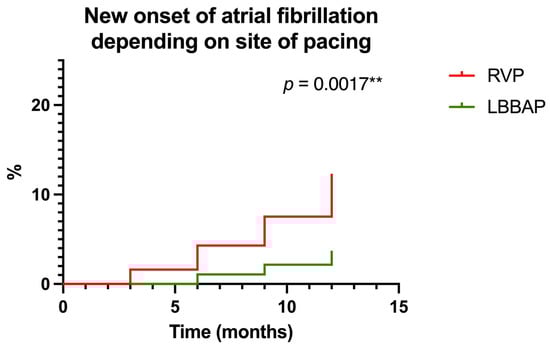 Probability of new-onset atrial fibrillation according to the pacing area (right ventricular pacing—RVP versus left bundle branch area pacing—LBBAP) at one-year follow-up. ** highly statistically significant.