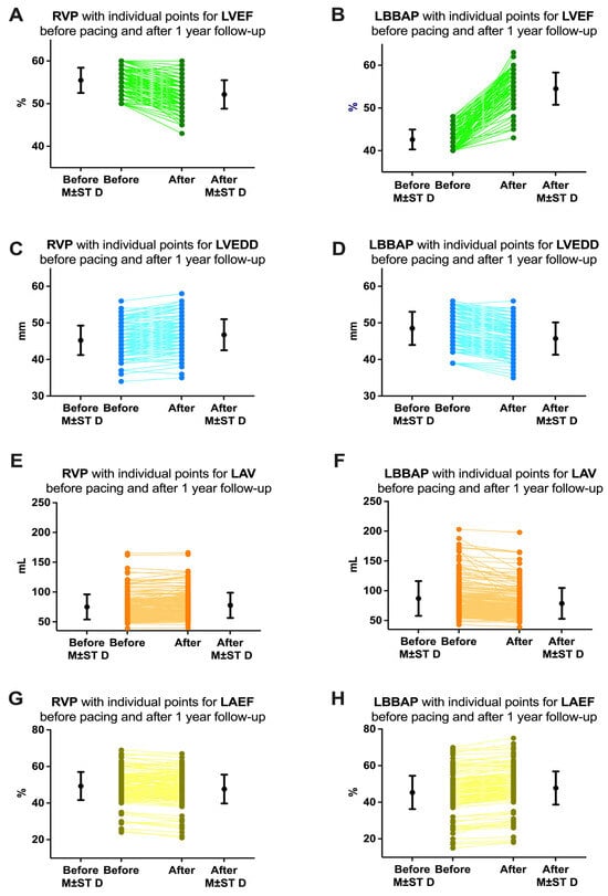 Variations of echocardiographic parameters analyzed in our study before pacemaker implantation and at 1 year of follow-up. (A) Left ventricular ejection fraction (LVEF) in patients with right ventricular pacing (RVP) and (B) in patients with left bundle branch area pacing (LBBAP). (C) Left ventricular end-diastolic diameter (LVEDD) in patients with RVP and (D) in patients with LBBAP. (E) Left atrial volume (LAV) in patients with RVP and (F) in patients with LBBAP. (G) Left atrial ejection fraction (LAEF) in patients with RVP and (H) in patients with LBBAP. M ± ST D = mean and standard deviation.