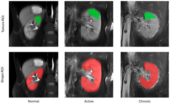The employed feature extraction workflow comprised the following steps. For each subject included in this study, a middle cross-section of the kidney along the anterior–posterior acquisition axis was selected from the entire 3D volume. Following this, a pentagonal region of interest (ROI) was manually drawn over the tissue area directly above the kidney pelvis (Figure 1). This region was selected for analysis because it is anatomically most representative of the kidney and most repetitively observed on MRI images. A pentagonal ROI was chosen because it was the simplest yet sufficiently flexible shape that could be adjusted to the geometry of a kidney. Next, the pixel intensities within the ROI were normalized to the range defined by the mean intensity of the ROI and the interval of ±3 standard deviations (so-called 3-sigma normalization). The normalization ensures that the computed features are independent from any acquisition settings, scanner parameters or signal energies which may differ between readings, i.e., all factors which affect final image brightness and contrast. Finally, the texture analysis was performed within each ROI, and the computed feature vectors completed with a category label (1—normal, 2—active, 3—chronic) were stored in an output CSV file.
