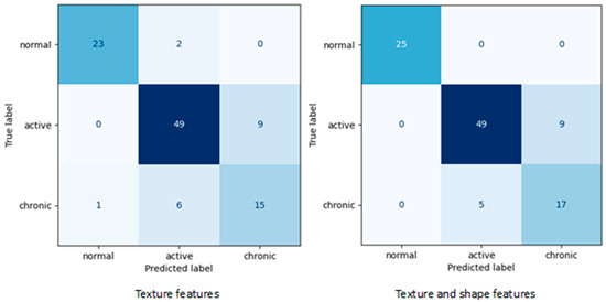 As a result of the first stage of the experiment, various subsets of features relevant to renal tissue classification were identified. Table 3 shows the lists of selected features depending on whether the kidney shape attributes were included in the analysis or not. For the meaning of specific feature names, please refer to the qMazDa manual [18]. Moreover, Table 4 includes all evaluation metrics calculated for final SVM models corresponding to the confusion matrices shown in Figure 2.