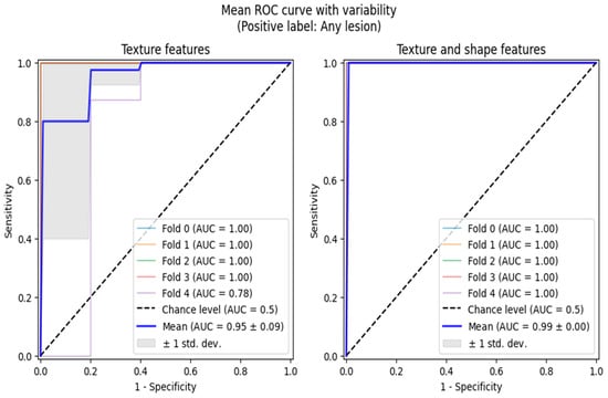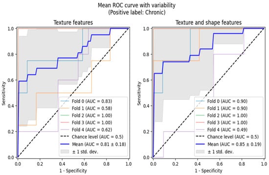 Additionally, we performed ROC analyses in two scenarios, both of which involved reducing the multi-class classification problem to binary ones, adequate for ROC curve analytics. Firstly, we grouped active and chronic subjects into one category and performed normal vs. any lesion analysis. The second analysis was performed only between the chronic and active classes. The ROC analyses were also conducted in the 5-fold cross-validation setting, allowing us to highlight the regions of one standard deviation width around the mean ROC curves (Figure 3 and Figure 4).