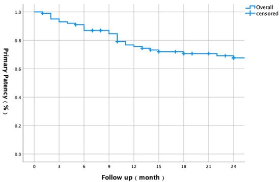Kaplan–Meier curve showing two-year primary patency rates for all lesions (n = 101) in patients with diabetic foot ischemia. Primary patency was 75.6% at 1 year and 67.6% at 2 years.
