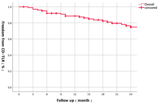 Kaplan–Meier curve illustrating two-year freedom from clinically driven target lesion revascularization (CD-TLR) for all lesions (n = 101). Freedom from CD-TLR was 87.4% at 1 year and 74.8% at 2 years.