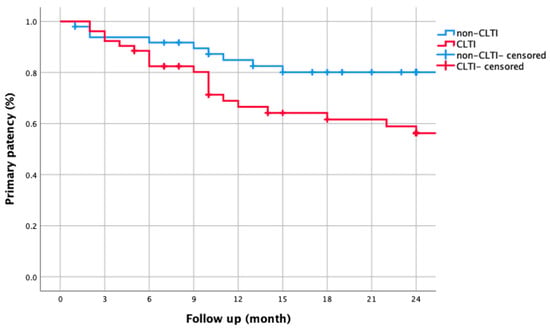 Kaplan–Meier curve comparing two-year primary patency rates between non-CLTI and CLTI groups. Non-CLTI patients had significantly higher patency (84.9% vs. 66.5% at 1 year; 80.1% vs. 56.3% at 2 years, log-rank p = 0.026).