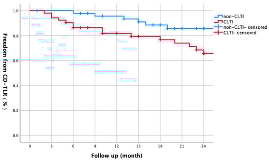 Kaplan–Meier curve comparing two-year freedom from CD-TLR between non-CLTI and CLTI groups. Non-CLTI patients had higher CD-TLR-free survival (93.4% vs. 79.3% at 1 year; 85.7% vs. 65.6% at 2 years, log-rank p = 0.035).
