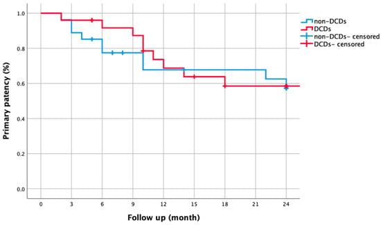 Subgroup analysis: Kaplan–Meier curve comparing two-year primary patency rates in CLTI patients with versus without drug-coated devices (DCDs). Patency rates were similar (68.7% vs. 67.8% at 1 year; 58.5% vs. 57.3% at 2 years, log-rank p = 0.768).