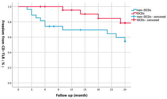 Subgroup analysis: Kaplan–Meier curve comparing two-year freedom from CD-TLR in CLTI patients with versus without DCDs. DCD use was associated with improved CD-TLR-free survival (90.2% vs. 69.4% at 1 year; 78.5% vs. 54.6% at 2 years, log-rank p = 0.048).