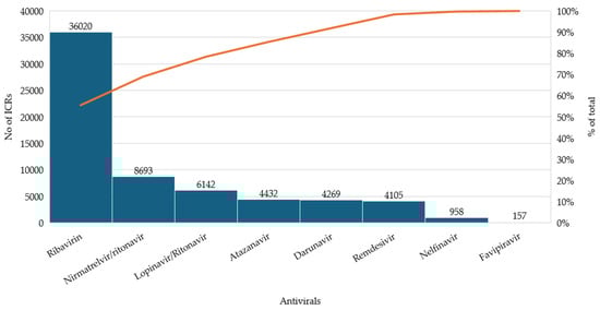 The largest proportion of reports (>80%) was associated with repurposed antivirals that were not officially adopted in COVID-19 treatment guidelines. RBV alone contributed 55.61% of all cases, while LPV/r, ATV, DRV, and NFV also presented considerable proportions. These differences are visually summarized in Figure 1, highlighting the relative impact of each antiviral within the overall dataset.