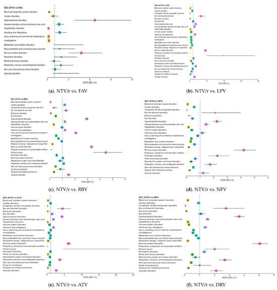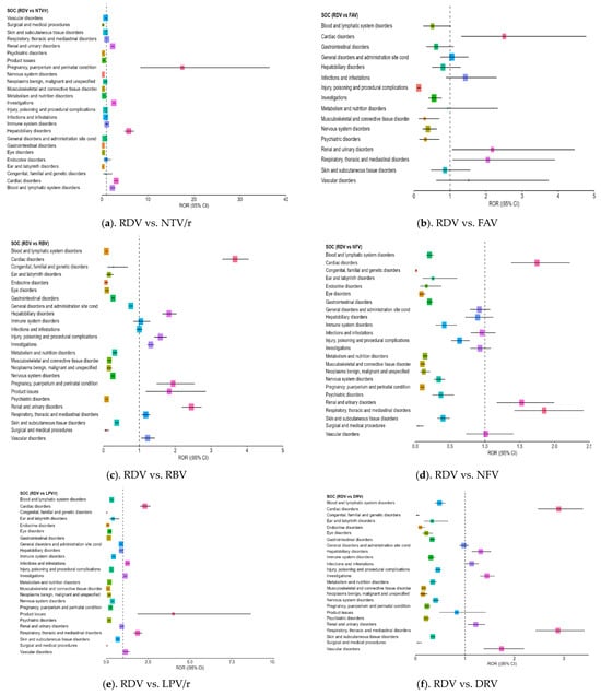 Forest plot illustrating the RORs for adverse events associated with remdesivir compared to other antivirals. Each point along the X-axis represents the estimated ROR for a specific SOC, with horizontal bars indicating the 95% CI. The vertical dotted line marks the neutral value of ROR = 1, which serves as the reference threshold. Points located to the right of this line suggest a higher frequency of reports for RDV, while those to the left indicate more frequent reporting for the comparator drug. RDV—remdesivir; NTV/r—nirmatrelvir/ritonavir; FAV—favipiravir; LPV/r—lopinavir/ritonavir; RBV—ribavirin; NFV—nelfinavir; ATV—atazanavir; DRV—darunavir.