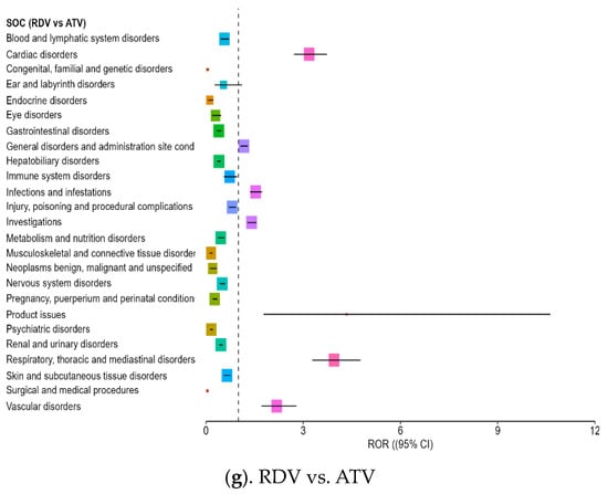 RDV showed a higher number of positive ROR signals (ROR > 1) than any other antiviral, particularly in clinically important SOC categories (Figure 2a–g). The most consistent and clinically relevant findings were observed in the following: