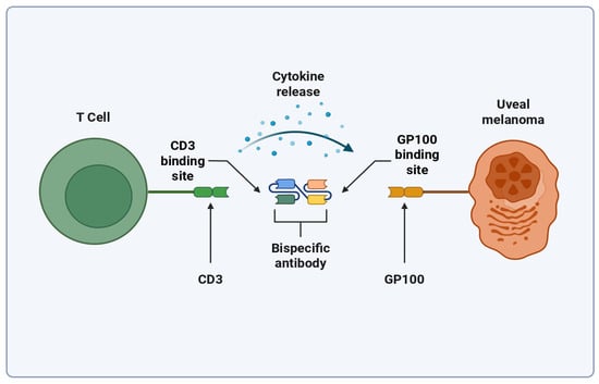 Tebentafusp is a bispecific T cell-engaging antibody designed to attach to Glycoprotein-100 (GP100) molecules displayed on Human Leukocyte Antigen-A0201 (HLA-A0201) on the surface of uveal melanoma cells, where this molecule is commonly found [48]. Figure 2 shows an illustration of this binding. Variability in the expression of GP100 in primary and metastatic melanomas exists, although it was found that it does not change the outcome of Tebentafusp [49,50]. A phase three trial was completed in 2021 which showed that Tebentafusp markedly improved outcomes in those with the disease (NCT03070392). It was found that the one-year survival rate for patients taking Tebentafusp to be 73%, up from 59% in the control group (p < 0.001) [48]. This led to the FDA approval of the drug in January of 2022, making it the first and only TCE to be approved for use with melanoma [51]. A study completed in 2022 further showed that Tebentafusp improves patient outcomes in patients with previously treated metastatic uveal melanoma, widening the scope of the treatment’s usage (NCT02570308) [52]. A common complication of Tebentafusp and other TCEs is the development of Cytokine Release Syndrome (CRS), a currently poorly understood complication that results in a large increase in a wide variety of cytokines [53]. In addition, 83% percent of patients who receive Tebentafusp have adverse cutaneous reactions, likely because of the gp100 expression in melanocytes [54,55]. A study suggests that Tebentafusp may be modifying the tumor microenvironment (TME) to favor metastatic melanoma outcomes by increasing IL-7R gene expression in memory and naive T cells, and by increasing local Interferon (IFN) signaling [50,56,57]. Cells exposed to IFN-γ have been found to be more sensitive to cytotoxic T cell attacks through the upregulation of molecules associated with major histocompatibility complex (MHC) class 1. Also of note is that CD4+ and CD8+ T cells make a positive feedback loop with the IFN-γ they release, and that natural killer (NK) cells provide the main innate immunity production of IFN-γ [58].