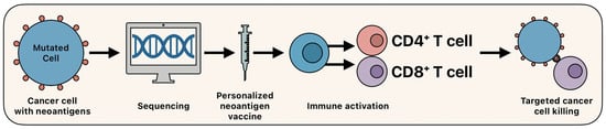 The development of PNVs involves several stages shown in Figure 3. Tumor-specific mutations are identified via whole-exome or RNA sequencing, followed by epitope prediction using MHC-binding algorithms. Candidate neoantigens are then synthesized and formulated into a vaccine and delivered either intradermally, via intranodal injection, or orally [74,76]. These vaccines function by activating dendritic cells and priming cytotoxic and helper T lymphocytes. Unlike TAAs, neoantigen vaccines elicit highly specific responses, minimizing off-target effects and reducing immune tolerance [77].