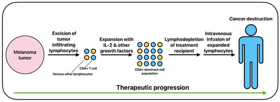 TIL therapy for melanoma generally involves excising a portion of the melanoma tumor, expanding TILs that show the tumor killing response in vitro with IL-2 and other growth factors, and intravenously infusing the TILs back into the patient (Figure 4) [91,92]. TILs will generally be selected for by CD8 positivity after expansion due to CD8 positivity indicating proven response rates in cancer destruction [93,94]. Prior to post-expansional TIL infusion, patients will typically be administered a non-myeloablative lymphodepletion regimen that will allow the infused TILs to take full precedence in immune response to the targeted tumor [85]. Lymphodepletion is usually achieved via chemotherapy regimens or total body irradiation, thus allowing the downregulation of regulatory T cells and an upregulation of cytokines that promote positive treatment response [85,95,96].