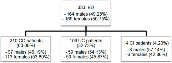 The group consisted of 333 patients, including 164 males (49.25%) and 169 females (50.75%). A total of 210 (63.06%) patients suffered from CD (97 males, 46.19%, and 113 females, 53.80%; p = 0.145). UC was diagnosed in 109 (32.73%) patients (59 males, 54.13%, and 50 females, 45.87%; p = 0.214). A total of 14 (4.20%) patients (8 males, 57.14%, and 6 females, 42.86%; p = 0.546) had IBDU (Figure 1).