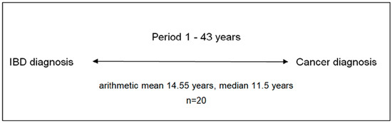 A total of 20 patients were first diagnosed with IBD and then 14.55 years (median = 11.50 years; range = 1–43 years; IQR = [17.5–6.5]) later with cancer (Figure 2).