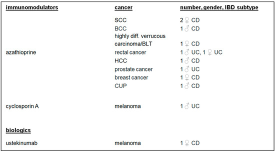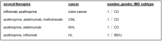 A total of 20 patients first diagnosed with IBD and later with cancer were additionally marked in the table. The IBD therapies of those 20 patients included immunomodulators (azathioprine, mercaptopurine, cyclosporin A, and methotrexate) and biologics (infliximab, adalimumab, golimumab, ustekinumab, and vedolizumab) (Table S5). Certolizumab was used in two patients as a therapy for concomitant rheumatoid arthritis. It is not approved as an IBD therapy in Germany.