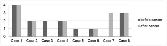 A total of 8 out of 20 (40.00%) patients had colonoscopies before and after cancer diagnosis (Figure 5). Five (62.50%) patients exhibited the same level of activity in the colon (low: 1 case; mild: 2 cases; significant: 1 case; pronounced: 1 case) before and after their cancer diagnosis. Two (25.00%) patients had low (1 case; 12.50%) or mild (1 case, 12.50%) activity and no activity after cancer diagnosis. One (12.50%) patient did not have any macroscopic inflammatory activity in the colon before the cancer diagnosis. After the cancer diagnosis, significant inflammation was detected.