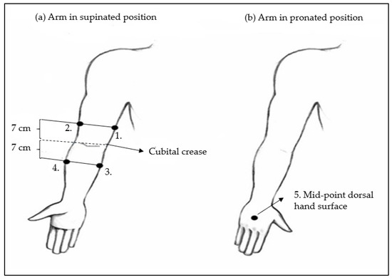 In the initial measurement position, participants were seated with their upper arm slightly abducted, elbow fully extended, and hand in supination. For the fifth measurement, participants placed their hands in a pronated position on the dorsal side of the hand. Measurement points were marked at five locations on each limb using a non-stretched centimetre tape, as described in the literature [15]: Upper arm medial and upper arm lateral, 7 cm above the cubital crease; medial and lateral forearm, 7 cm below the cubital crease; and dorsal hand surface, mid-point between the wrist and the first metacarpophalangeal joint. A total of 10 measurement sites per participant were assessed, 5 on each arm (Figure 2).