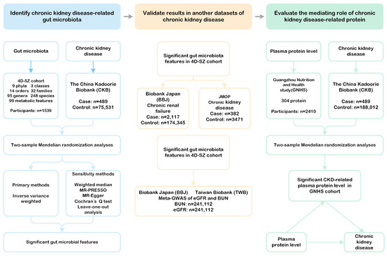 GWAS summary data for gut microbiota from the 4D-SZ cohort (from Shenzhen, China) discovery cohort are available at https://ftp.cngb.org/pub/CNSA/data2/CNP0000794/microbiome/ (access date: 15 November 2024). Chronic kidney disease from the China Kadoorie Biobank (CKB) by Walters et al. at https://pheweb.ckbiobank.org/pheno/n18 (access date: 15 November 2024). Chronic renal failure from the Biobank Japan by Sakaue S. et al. at https://pheweb.jp/pheno/Chronic_Renal_Failure (access date: 15 November 2024). Chronic kidney disease from the J-Kidney-Biobank (JKB) dataset by Sugawara, Y. et al. at https://jmorp.megabank.tohoku.ac.jp/gwas-studies/TGA000006 (access date: 15 November 2024). Meta-GWAS of BUN and eGFR from the discovery dataset of Biobank Japan (BBJ) and Taiwan Biobank (TWB) by Chen, HL. et al. at https://doi.org/10.6084/m9.figshare.24356587 (access date: 15 November 2024). Plasma proteins level from the Guangzhou Nutrition and Health Study (GNHS) by https://omics.lab.westlake.edu.cn/data/proteins/ (access date: 15 November 2024).
